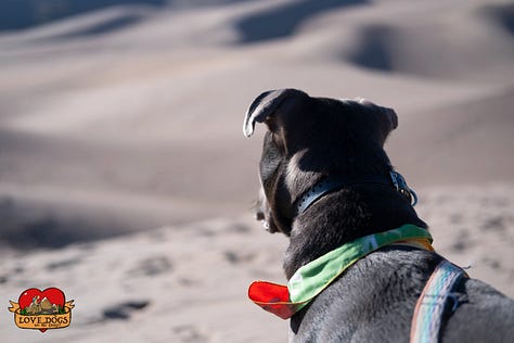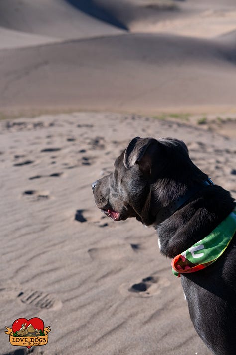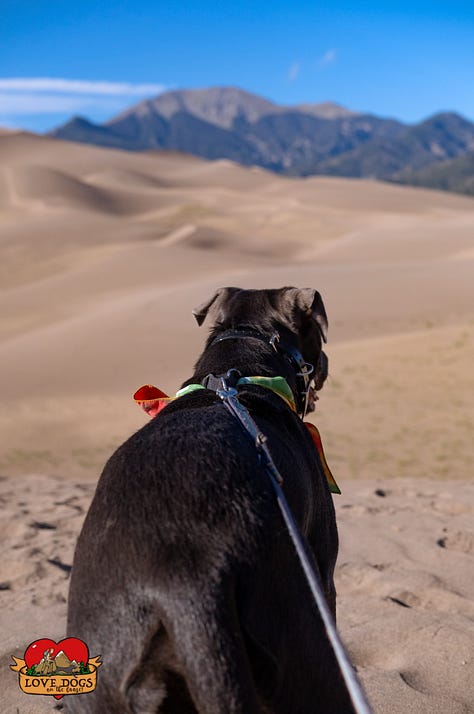 Since we finished the trail so early, and we weren’t far from Great Sand Dunes National Park (and my friend had never been before), we stopped there on the way home. I expected to just drive in, take a look around, and drive out, since typically dogs aren’t allowed to do much of anything in national parks (I actually mostly avoid them for this reason). But as we paid the entrance fee at the gate, I asked if dogs were allowed on the dunes, to which she replied “They’re allowed on the first ridge of dunes only.”
