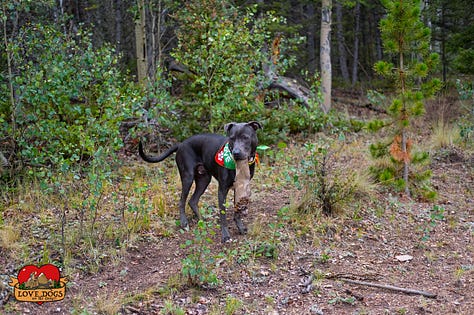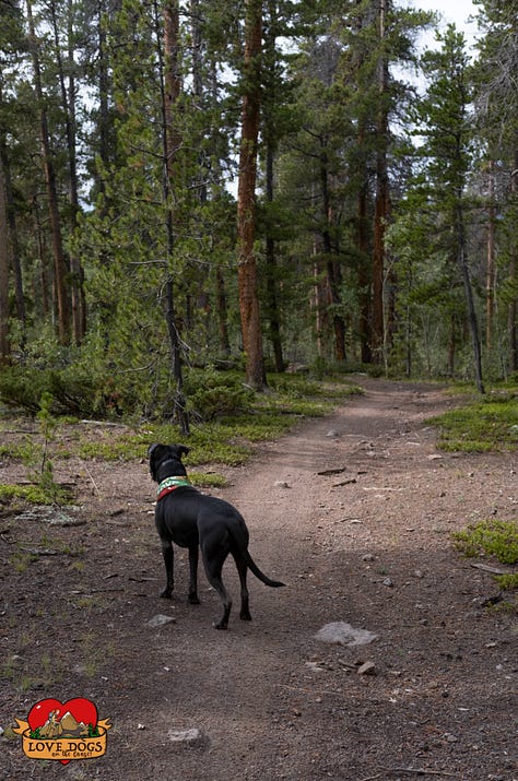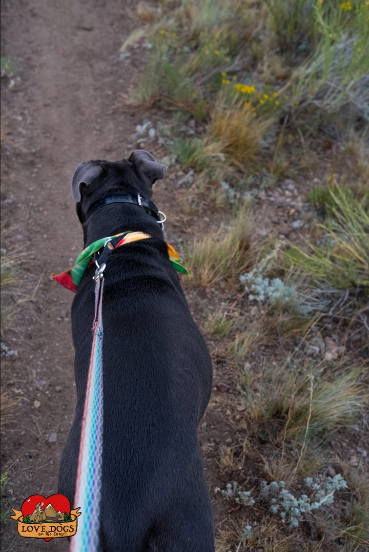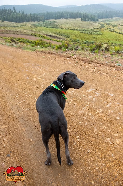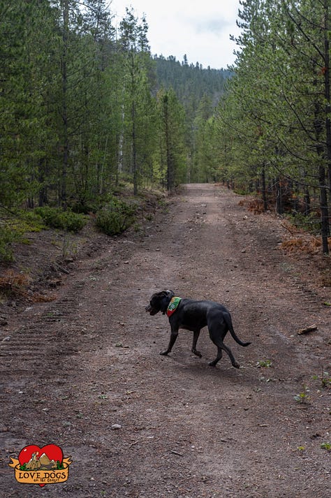 But more to the point: I’m so impressed with how well Japhy is doing on the trail. His demeanor around other people, dogs, mountain bikes, and wildlife—and during storms that drop everything from steady mist to marble-sized hail on us—is impeccable, really. You’d expect the natural canine tendency to chase wildlife. You’d expect some anxiety during a hail storm that’s accompanied by random intense crashing thunder all around. You’d even expect a little bit of resistance to walking into the wind during a steady cold rain. Japhy cares not about walking in the rain. He cares not about the loud claps of thunder or the marble-sized hail (except for wanting to eat it). He cares not about mountain bikes, and with the assistance of an e-collar he’s learning to behave around the wildlife. More about that later. First, the two photos below are from early in our hike this weekend: Pretty Blue Boy getting adjusted to leash-walking on the little bit of single-track we encountered on this section. It’s harder than it looks to hike single-track with a dog on-leash, because the trail is narrow and often rutted, and so you either walk side-by-side and try to fit on the single-track or when the terrain allows it, the dog walks next to the single-track, or—our preferred method—the dog goes first and you try not to step on paws. It’s complicated, but once in a groove it works pretty smoothly. Japhy does struggle with this just a little bit, but overall he does OK. For the first day or two, Mani would always pull me down the trail before she settled into a groove. It’s to be expected with all of the excitement of being out in the wilderness where there are so many neat things all around.