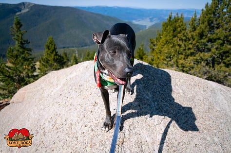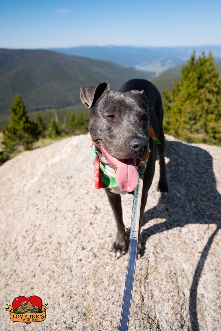 In closing, I am 99.999% certain that Japhy thoroughly enjoyed his first backcountry mountain adventure. When The Boy is really excited, he can't walk straight. He weaves from left to right, swinging his tail from side to side as if it's an engine propelling him wildly forward. He walked the entire 10.6 miles with his head held high, looking quite confident and proud. He sniffed All The Things, licked an ant off a rock (oops), learned to jump over mud puddles on single track (kind-of), saw his very first deer up close and didn't try to chase it, saw ground squirrels and chipmunks and didn't try to chase them, mostly didn't pull on the leash as we traveled the path together paw over foot, did not become impatient when we stopped to rest, climbed all over the boulders like a professional parkour artist, and perhaps most importantly had zero injuries or allergic reactions (hooray!). And I 100% enjoyed watching him have these new experiences.