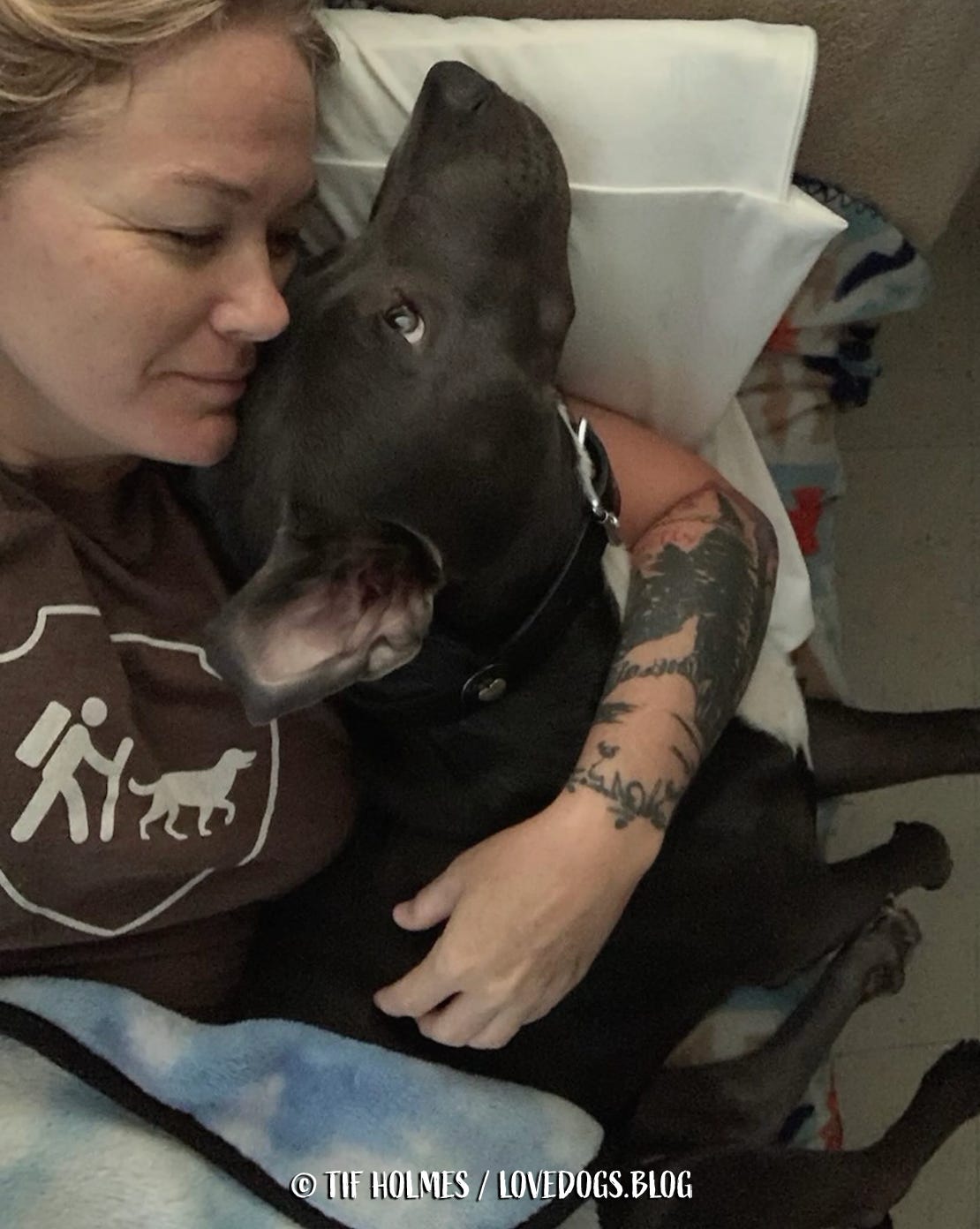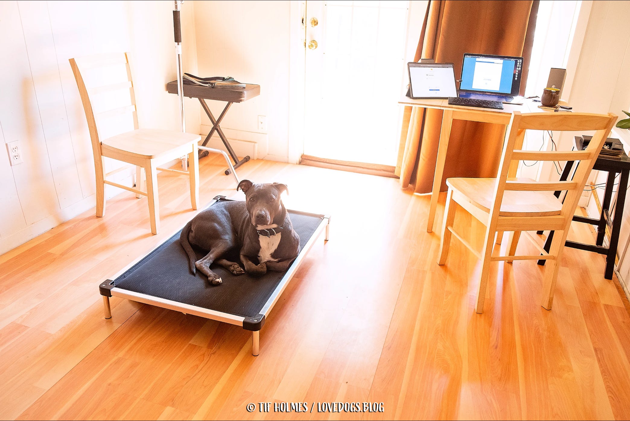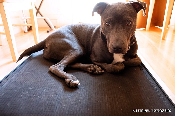 It's been six months since I adopted Japhy, he just turned one, and the most significant behavioral challenge we're still addressing is his obsessive chewing. Not only does he chew things, he swallows pieces of the things he chews instead of allowing them to fall out of the sides of his mouth, making this tendency all the more dangerous. Chew toys are just not an option for him, as he can quickly destroy (and eat) even those touted as indestructible. I've had to take the dog blankets out of his kennel recently, because I just can't seem to dissuade him from chewing on them, even with six bones from Three Dog Bakery laying within eyesight and a broken record of "Find your bone" and "Go to sleep" streaming from my mouth in attempts to redirect him. A few days ago I pulled out of his mouth a saliva-soaked piece of one of his blankets that was probably 2" long by 1" wide when unpacked from its little chewed-up wad. Had I not seen him chewing on something and unceremoniously reached into his big mouth to remove it, I'm certain he would have swallowed it (I've trained him with the "open" command to open his mouth and allow me to look/reach inside, so the whole sticking my fingers inside a big dog's mouth is actually less unwise than it sounds in this particular instance, though it was still rather unceremonious for him). The big fluffy round bed that I'd bought for him after he destroyed the big fluffy rectangle bed that a friend had bought for him lasted the longest of any bed to date, but alas, it has ended up in the dumpster with the others before it. That was the third bed he's had, not including the elevated bed I bought for Mani that I'd kept outside in the yard. It was made of some type of tightly woven nylon fabric that was wrapped around the frame of the bed. Upon bringing that bed inside the house after he destroyed the big fluffy round bed, he proceeded to chew the nylon fabric off the frame. I moved it back outside before he could completely ruin it. As an outside "place" it still works for Japhy. But inside, where he is more prone to bouts of boredom, not so much. Incidentally, he also utterly refused to sleep on that bed at night, getting up repeatedly throughout the wee hours and walking over to the edge of my bed begging me to let him up. The entire night consisted of me telling him, "Go back to your bed," and him continuing to stand at my bedside nudging parts of my body with his nose, occasionally daring to place a paw up on the edge of the bed for me to pick up and push off; and that interaction would repeat throughout the night with me half asleep and growing grumpier and grumpier through it all. I don't have an issue with him being on my bed; however, my "bed" isn't really a bed. It's a chaise lounge. And while there was [barely] enough room for Mani to sleep with me on it, there is most definitely not enough room for thicc boi to sleep with me on it comfortably and without one of us eventually falling off (one guess who that would be). So I've been pretty hard-nosed about making him sleep on his own bed. Until about 4 a.m. Then, I allow him to [in the most ungraceful manner possible] climb up onto the 12" or so between me and the edge of the chaise, stepping on all the various parts of my body that he can in the process, and tuck himself into me as tight as he can to snooze off the remaining hours of darkness close to his mama. The whole paw-stomping event is actually pretty endearing, but only after I've had enough sleep to lessen the discomfort of being smashed awake by a however-many-pounds-now (70, maybe?) Pitbull.