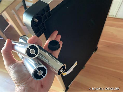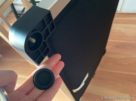 There's not much assembly required. None, actually, unless you count popping out the rubber foot pads and screwing in four legs. It came with the rubber pads in place of the legs, and if you wanted, you could leave those in and use it as a non-elevated crate pad. I bought Japhy the 41" x 27" size bed, which fits perfectly inside his 42" x 28" iCrate kennel, with legs and without. I had kind of wanted a smaller size for travel, but knowing how much this dog loves to stretch out, lay upside down with all fours every-which-way, and in all other sorts of crazy Pitbull positions, I went ahead and got the size that I knew would be plenty large enough for his Goofy Self to spread out and be comfortable.