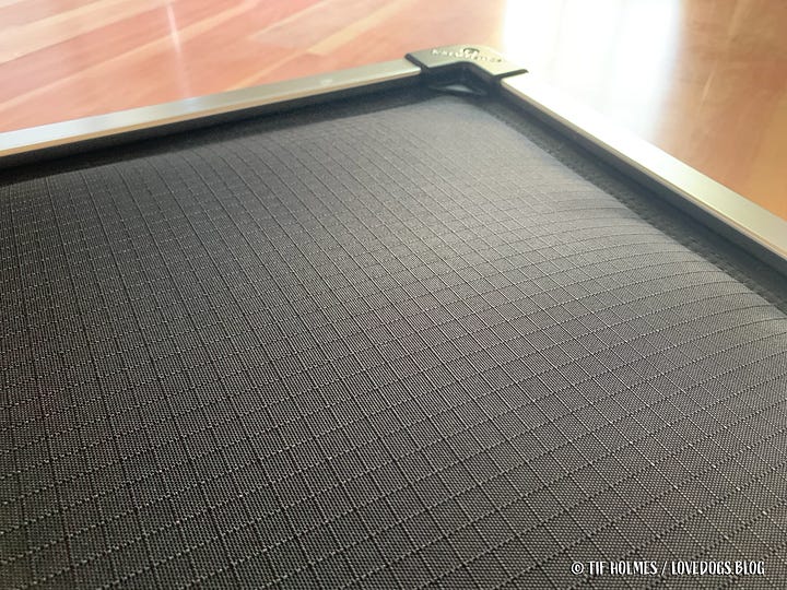 Some time ago I discovered K9 Ballistics, a company making "chew proof and tough" dog beds that come with a 120-day guarantee. I started following them on Instagram, looked around their website and signed up for their newsletter. I'd already looked closely at all of their beds and had been waiting for the financial opportunity to purchase the Chew Proof Armored Elevated Padded Dog Crate Bed. The other beds were rated as "tough" but not "chew-proof" and I knew Japhy would need one of the armored beds in order for it to have a realistic chance of surviving his mighty chewing habit for 120+ days. Having submitted Japhy's birth date when I signed up for their newsletter, they sent a coupon code in early June, and I was anxious to use it.